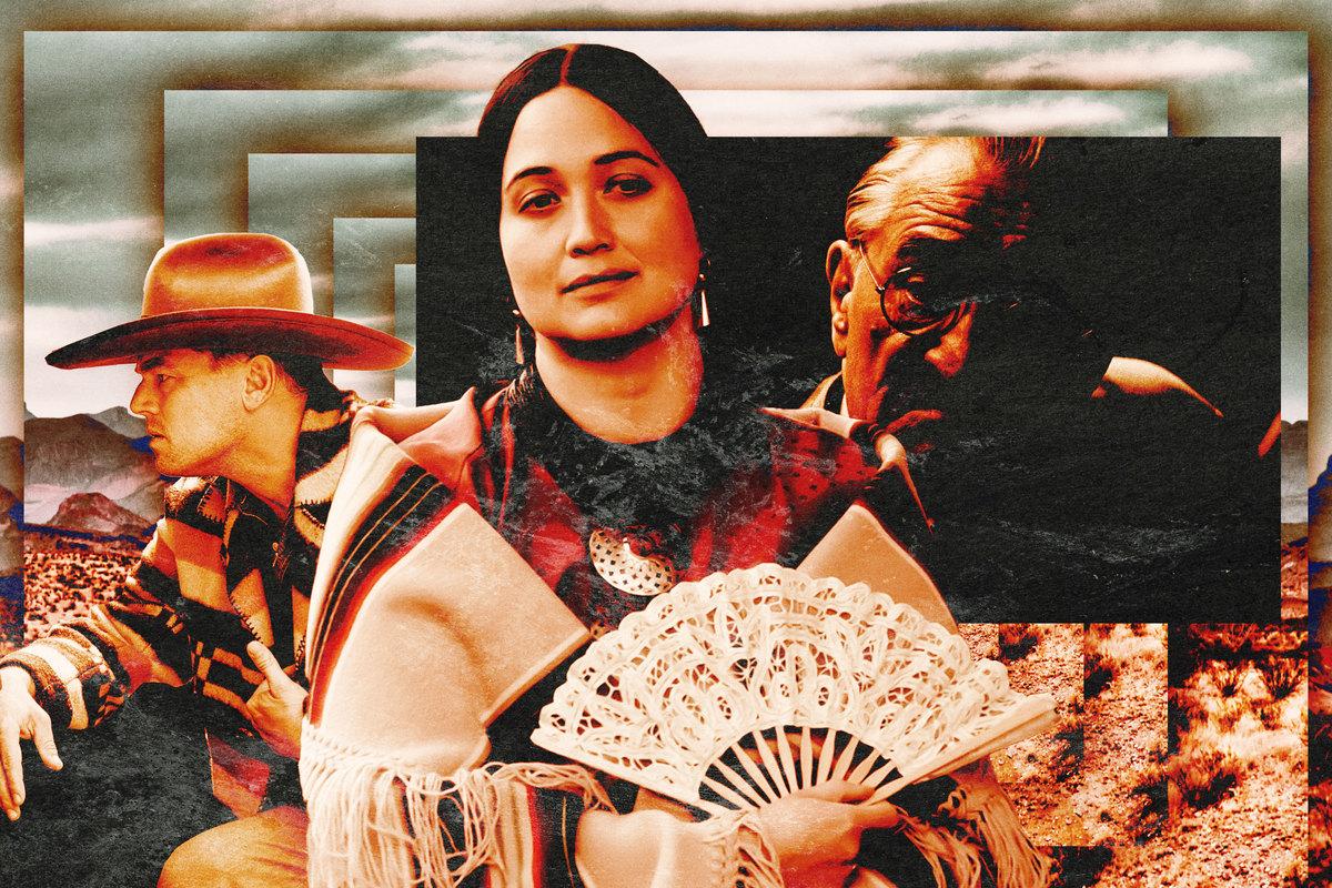 Few filmmakers have ever been as suited to run—and howl—with the wolves than Martin Scorsese, whether on Wall Street or elsewhere. He’s compelled by characters who barely suppress their animal urges, whether they’re raging bulls, pool sharks, or conniving rats. The concept of the 80-year-old Oscar winner as a gangster-movie specialist is hopelessly reductive, but there’s no question that he’s fascinated by pack mentalities and the survival-of-the-fittest hierarchies therein. And in adapting David Grann’s bestselling nonfiction book about the 1921 Osage Nation murders—a series of profitable and clandestine killings perpetrated by white residents against their Native neighbors—the director has gone back to one of the primal scenes of American tribalism and grift, albeit with a sensibility that’s significantly different from that of some of his other classic crime pictures. Where the brilliance of a movie like Goodfellas lies in its kinetic, seductive sense of propulsion—the out-of-body high of being swept up in the spoils of the outlaw lifestyle before the bottom drops out—Killers of the Flower Moon has been meticulously bled dry of such illicit sensations. It’s not a coke-binge rush, but a toxic IV drip. Usually, when Scorsese’s really cooking, there’s some kind of immediately identifiable money shot, something that expresses the sheer aesthetic joy of filmmaking. But the closest that Killers comes is an early passage featuring several Osage men becoming drenched in the oil geysering up from their land. Their ensuing dance, shot in dreamy slow motion against the thrum of the late Robbie Robertson’s guitar-driven score, is a late capitalist baptism—and a death sentence. It’s beautiful in an ominous, terrible way; there will be you know what.
