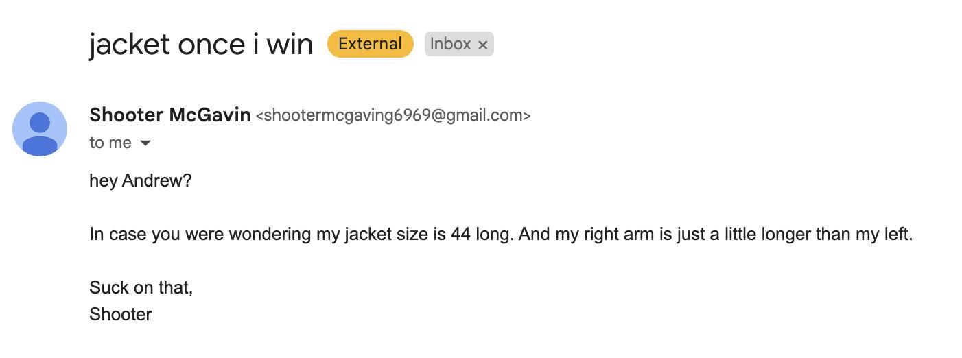 Now all those emails he was sending us about his jacket size—even though we never said we’d be giving the winning jerk any kind of trophy—look pretty cool: