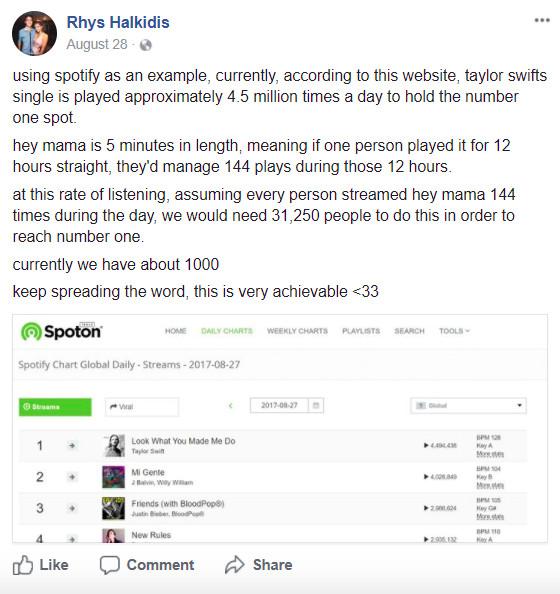 Days after the Reputation announcement, Halkidis created a Facebook event called “Hey Mama” Day and invited his friends to join. Halkidis and the other event administrators realized that topping the Billboard charts would be a tall order, so they set a more modest goal: beating Swift on the daily Spotify charts. Halkidis did the math—if he could get about 30,000 people to stream “Hey Mama” for 12 hours straight, they’d collectively attain more than 4 million streams. That’d be enough to match Swift’s numbers on August 27 for her lead single, “Look What You Made Me Do.” “Obviously the dream is to be no. 1,” Halkidis told me shortly before the campaign started. “That’s a massive mountain to climb.”