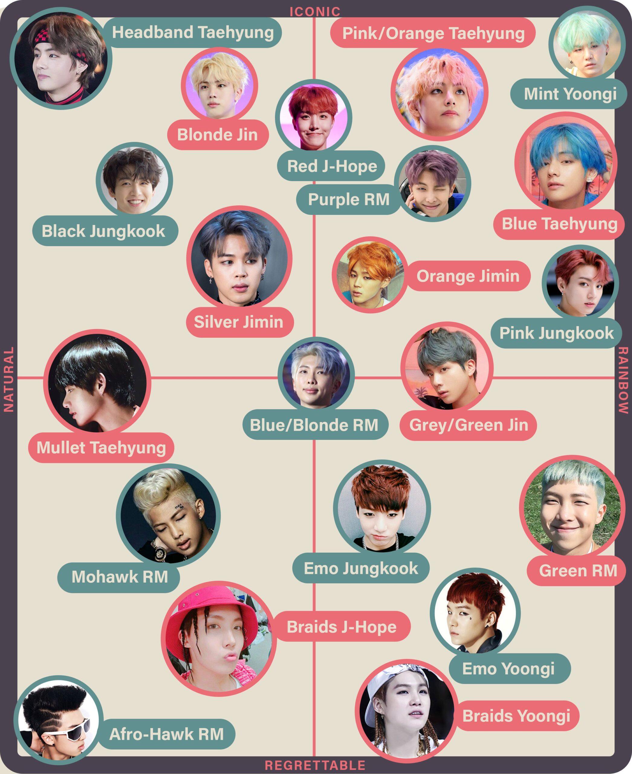 Now marks the perfect time to “map” out the group’s stylistic evolution in the years since their debut. Rainbow hair wasn’t always BTS’s signature style—they used to lean more toward a Hot Topic aesthetic, with jet-black pompadours and too much eyeliner. Thankfully, we’ve moved on to sunnier, more colorful pastures. And in an attempt to make sense of BTS’s most memorable hairstyles, I now present the official BTS Hair Matrix: