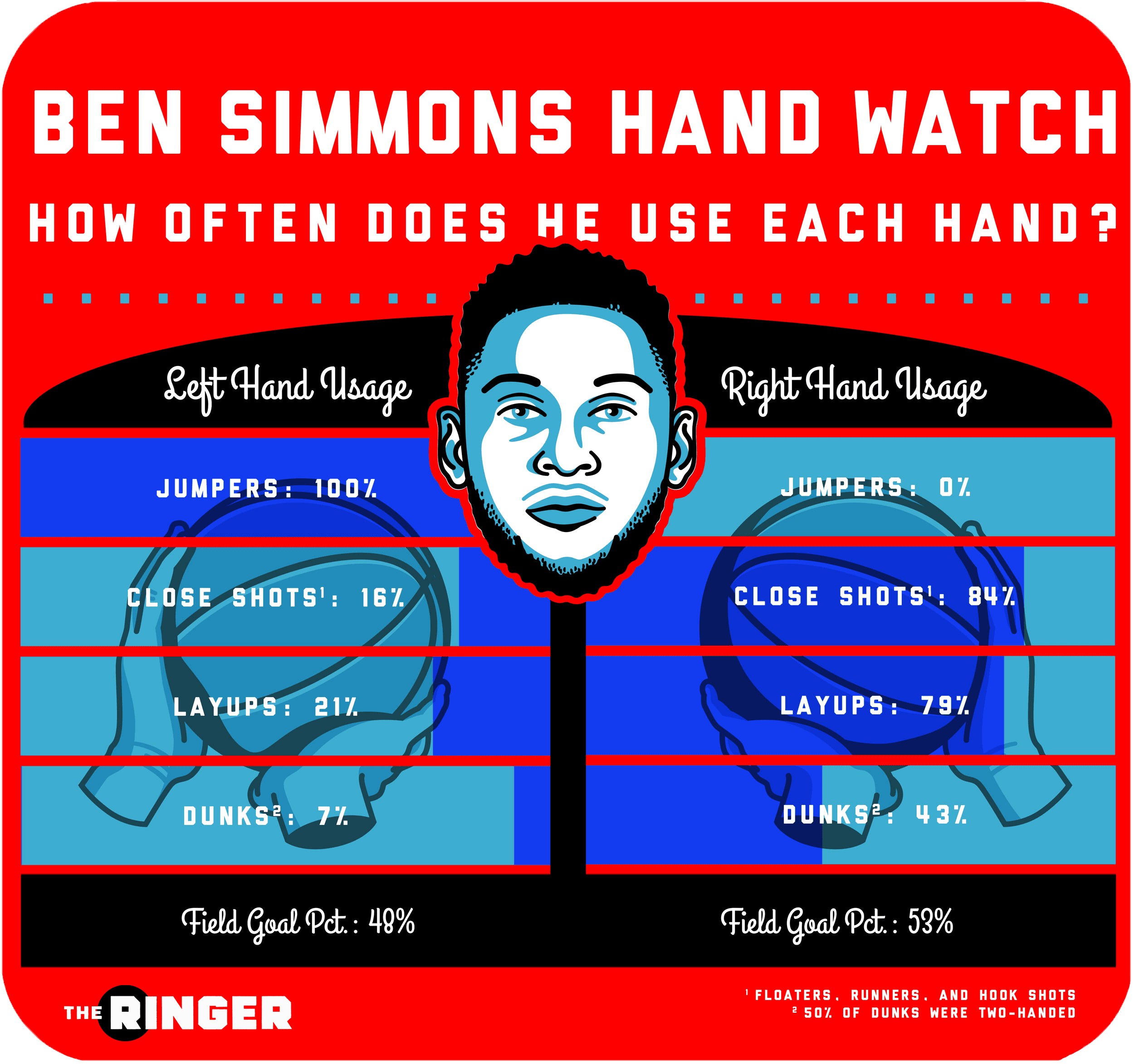 Simmons hasn’t attempted a single jumper outside of 16 feet (his five 3-point attempts are all heaves at the end of the quarter) and has hit only 30 of 51 free throws (58.8 percent). As we’ve discussed multiple times on The Ringer, Simmons uses his left hand 100 percent of the time when shooting jumpers and free throws. But at LSU, he used his right hand 81.8 percent of the time on all other shots (layups, dunks, floaters, running hooks). I’ve manually tracked Ben’s handedness numbers since he was in college and will continue to over his career until he switches hands (or until I get bored). Simmons does just about everything else with his right hand, including throwing, eating, and writing. “I think I was supposed to be right-handed,” Simmons told the New York Daily News in 2016. He’s right. He shoots with the wrong hand.