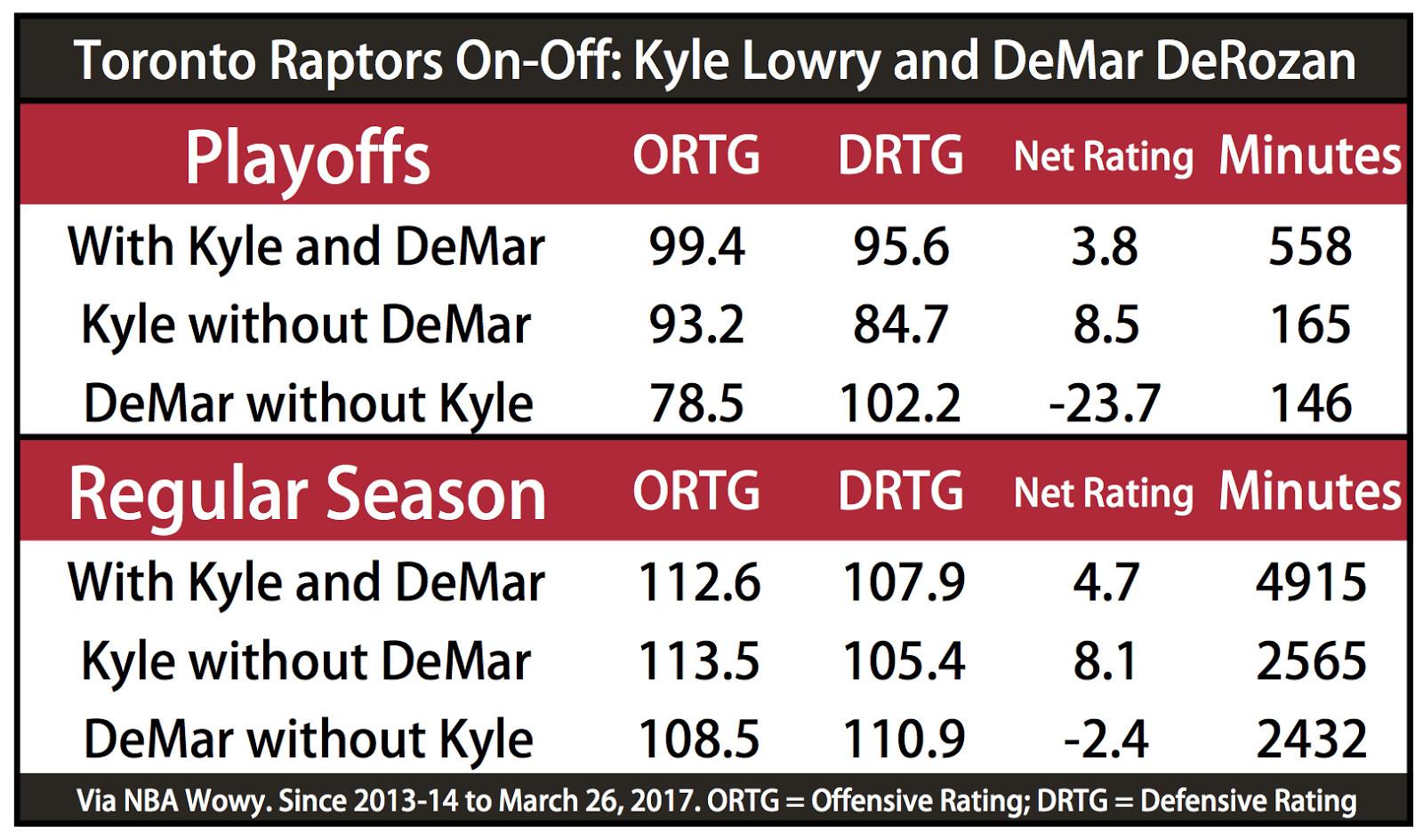 Lowry is older than DeRozan, and conventional wisdom would suggest hanging on to the younger of the two stars. But over the last three postseasons, the Raptors perform better when Lowry is on the floor without DeRozan. There are variables, such as opponents’ lineups and game situations, that play a role in that net rating differential, but it’s been a consistent-enough trend that we can safely say the Raptors’ postseason offense sputters with just DeRozan on the floor. Here’s the data, via NBA Wowy: