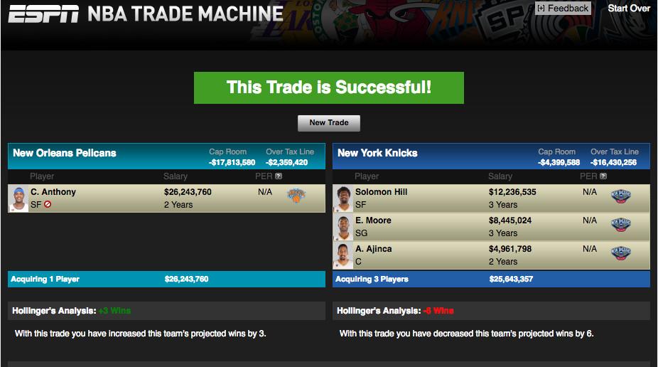 Even if Melo did agree to a deal, the Pelicans’ cap space is locked tight (reports indicate that this guy just swallowed the key), and their assets are limited. New Orleans is the only organization in the league without any outgoing or incoming picks, and a pick-laden trade appeals to a Porzingis-focused New York team. But finding a package of contracts to match Melo’s $26 million salary is messier. Even ones that come close monetarily —
