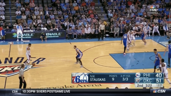 Thunder coach Billy Donovan isn’t going to just have Melo standing in the corner, though. Westbrook frequently runs the pick-and-roll, but the team lacked a reliable threat who could pop for 3s. In the past Anthony was reluctant to play power forward, but the hope is that Donovan can convince him that it’s for the best. But whether Anthony is at small forward or power forward, the Thunder must be having wild fantasies imagining Anthony on the pick-and-pop in place of McDermott or Domantas Sabonis in the following plays: