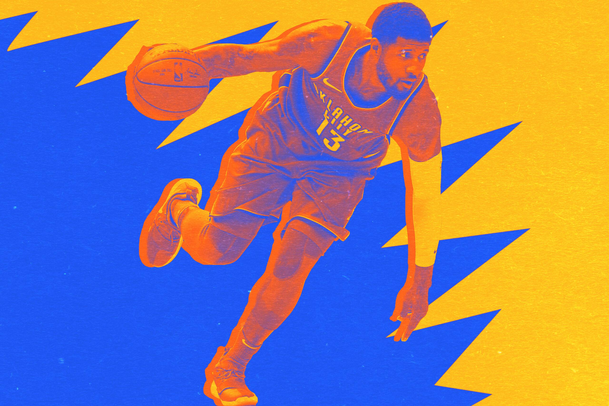 If Tony Snell is dimensionally the league’s most average player, George is the Vitruvian NBA superstar: The template of a modern player who can assume the responsibilities of three different positions, shoot 3s both pulling up and from a standstill, and play prideful defense and switch on any assignment. George’s half-season with the Thunder has so far affirmed that his versatility wasn’t just a convenient intellectual exercise for the offseason—he is every bit as plug-and-play as his game suggests. “I can play in any offense and play off any player,” he told reporters this week. The seamlessness with which he moves through different roles makes him singular in the league, though it comes at a stylistic expense. That isn’t to say he doesn’t play the game beautifully, it’s just that his game lacks the kind of idiosyncratic markers that define the league’s biggest stars. You’ll always see someone else in his game.