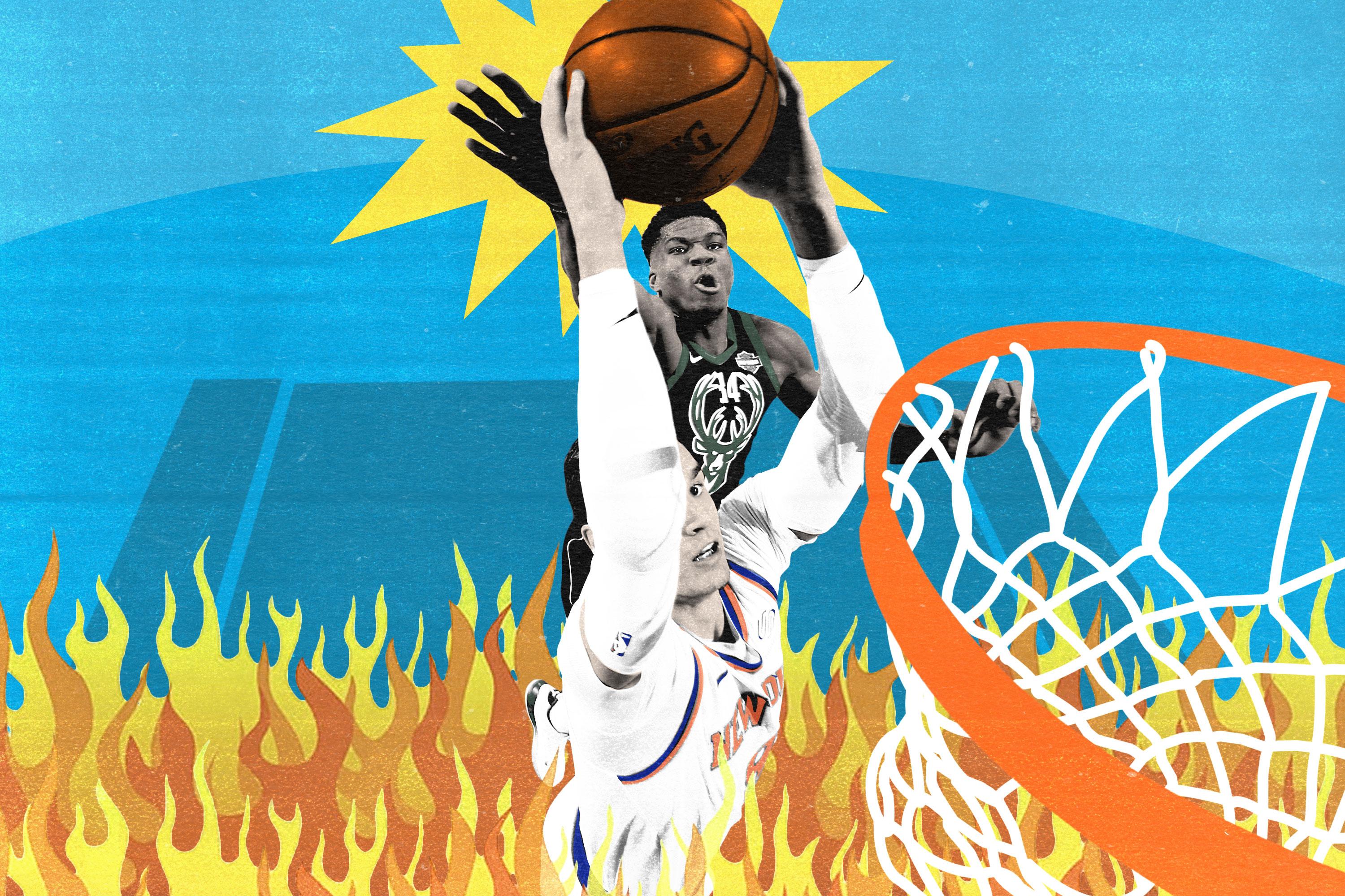 The move worked, and Hezonja jumped up to dunk it. What he’d not noticed, though—but what all-caps EVERYONE else had noticed—was that Giannis Antetokounmpo had zeroed in on him from behind the play, sprinting all the way up to try to block the dunk. And so when Hezonja jumped, so too did Giannis, and it looked like it was going to be another wonderful and impressive clip in Giannis’s already wonderful and impressive career highlight reel. Hezonja was going to jump, Giannis was going to jump, Hezonja was going to reach the ball out to dunk, and Giannis was going to smack it down Pennsylvania Plaza.