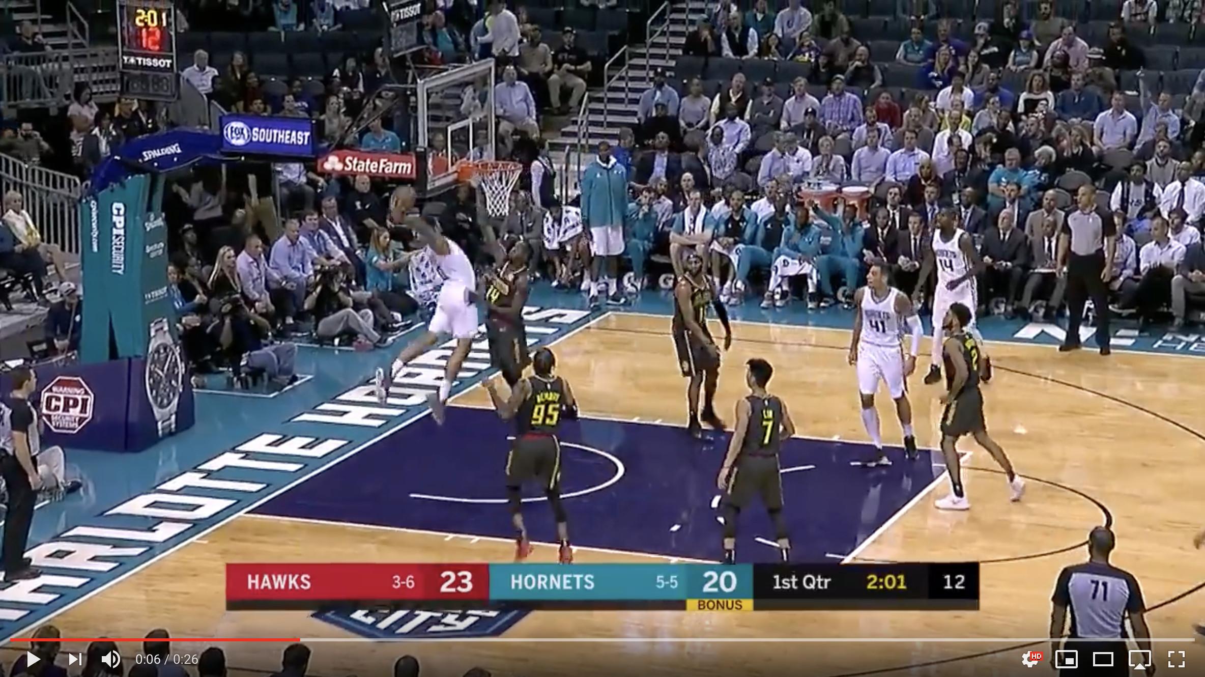 That’s a beautiful shape. It’s like the edge of a waxing crescent moon. It’s a thing that very good dunkers do because (a) it looks extremely cool, and (b) it makes the dunk harder to block, because they’ve both moved the ball farther back and also have generated way more force to push it past a defender’s block attempt. (This is why Bridges falls after the dunk. He’s anticipating that Dedmon is going to at least make a little bit of contact with the ball, so Bridges cocks it back extra far and smashes it forward extra hard. Since Dedmon isn’t able to get up where Bridges gets up, Bridges is thrown off-balance, like when you go to open a door that you think is very heavy and so you push it real hard but it turns out the door is light and you end up just whipping it open like an idiot.) If a player does the waxing crescent thing on a dunk, it automatically turns into a top-level kind of showing. Big score here for Bridges. 16/20.