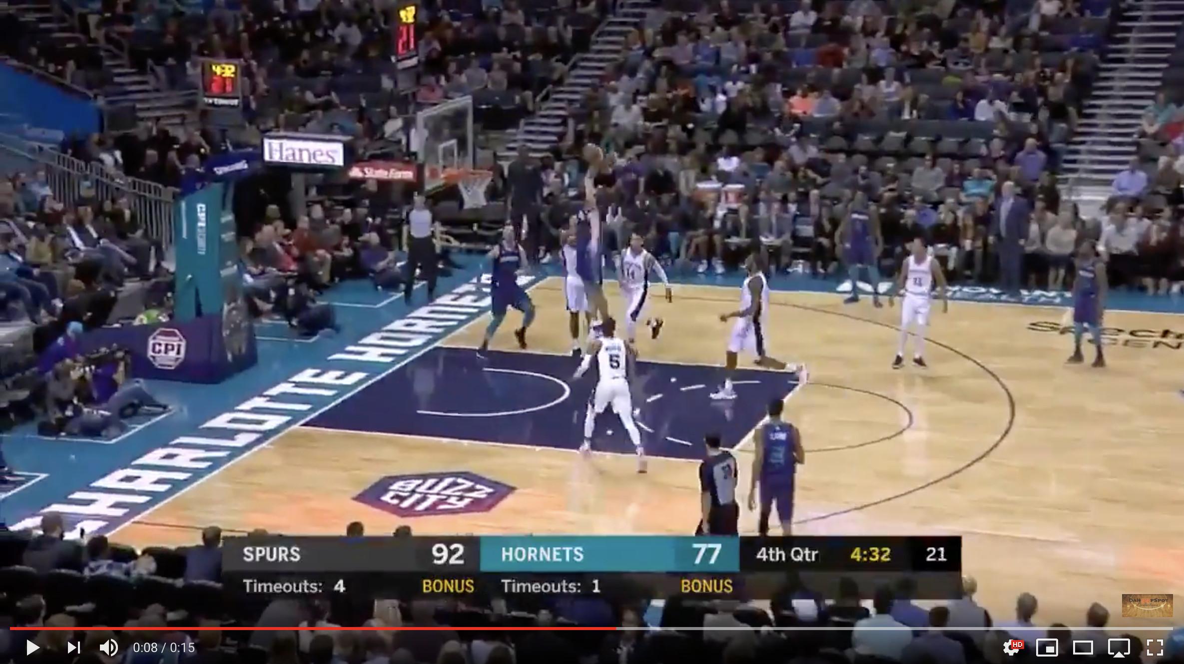 Category 1—Difficulty/impressiveness: Make no mistake about it, Cody is a big-game hunter at the rim. The first time I saw this quality in him in real time was a game between the Spurs and the Hornets last year when Cody dunked it from the dotted line on a fast break. He’d gone the whole game chipping people on screens on the perimeter and banging around in the paint in the most invisible way possible. But once he got an opening to attack the rim (he’d stolen an errant pass during a full-court press and then sprinted down the floor toward Charlotte’s side of the court), it was like he fucking insta-morphed into a serial killer. Here’s a shot of him during that dunk: