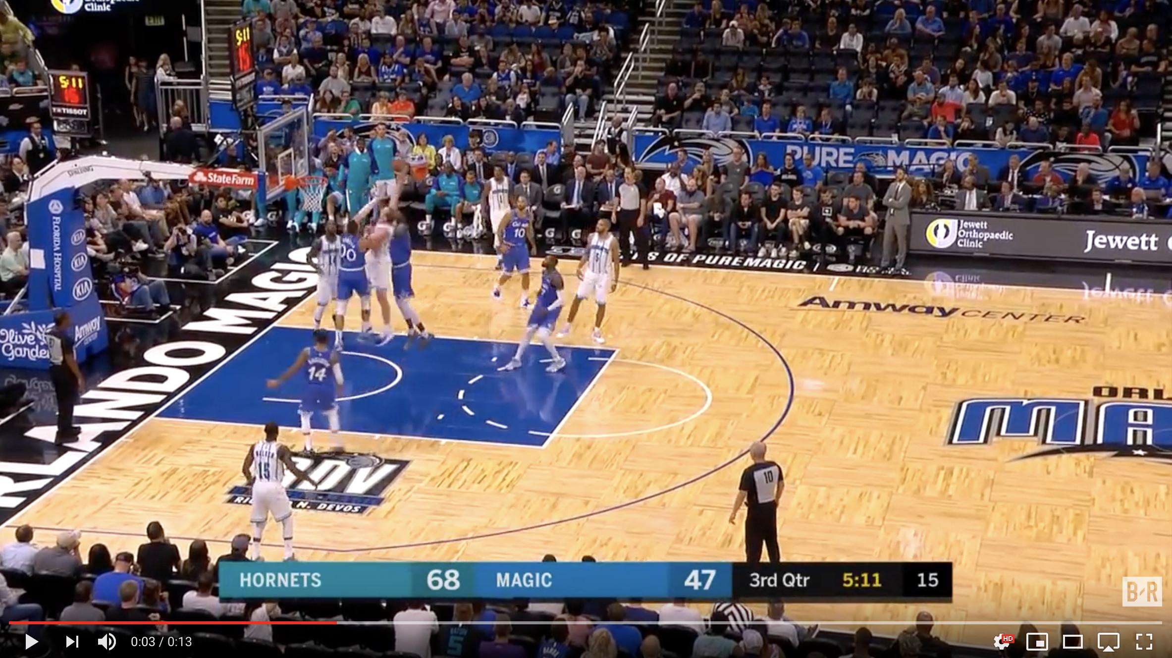 Category 6—Reaction of those not directly involved with the dunk: The thing of it is, this is a road game, yes, and the crowd reaction is typically less raucous for an opposing player’s dunk, but it’s also a road game IN ORLANDO, and so any noise at all has got to be considered a net win for the dunker. Plus, it happens on Charlotte’s side of the floor, which means we get to see their bench respond, and that’s always good. And plus-plus, we get a wonderful EARTHQUAKE RESPONSE from Kemba, which is also very good. (An EARTHQUAKE RESPONSE is one where a player dunks it with so much force that it causes another player on the court to bounce around or hop around, like what happens to stuff during a big earthquake.) 14/20.