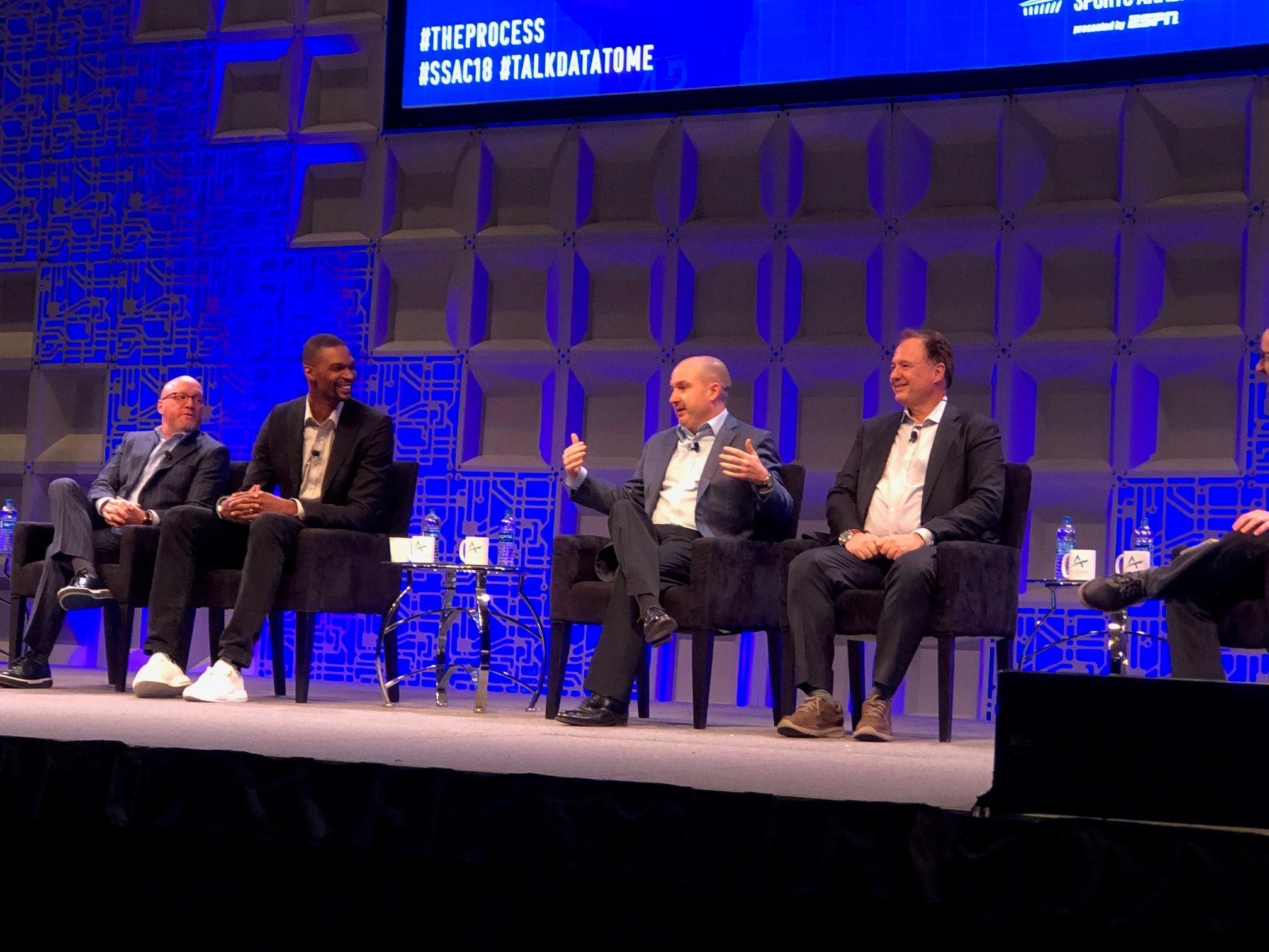 The organizers slapped that title on the session after Hinkie told Morey he’d speak at the conference. It also turned out to be the keynote panel on SSAC’s second and final day. Thousands of people packed into the biggest room in the facility, the same space where, just a day earlier, Barack Obama had been the headliner. The Process panel, moderated by Bleacher Report’s Howard Beck, included Clippers president of basketball operations Lawrence Frank, former Cavaliers general manager David Griffin, Celtics co-owner Steve Pagliuca, and 11-time All-Star Chris Bosh, who was seated to Hinkie’s immediate right. When Bosh was introduced, the crowd was largely quiet. When Hinkie was introduced, they erupted, prompting Beck to wonder aloud whether he’d just broken an SSAC record for applause.