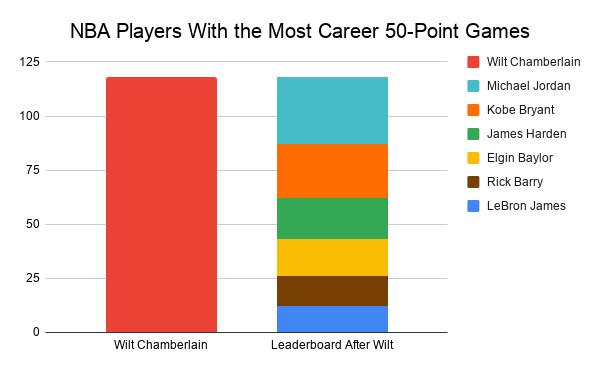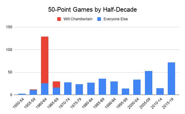 More precisely, 2015-19 saw many more 50-point games than any previous stretch in NBA history provided Wilt Chamberlain’s totals are excepted for their absurd outlier status. Chamberlain once averaged north of 50 points per game in a full season, which means he collected plenty of such games. He has the most 50-point nights (118) in league history, with as many as the players ranked second, third, fourth, fifth, sixth, and seventh on that list combined.