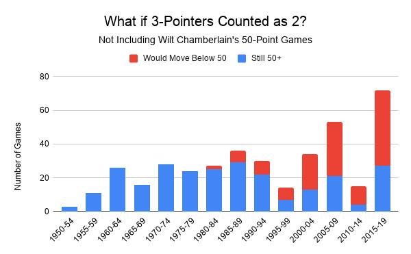 If the 3-point line didn’t exist—if all 3s counted as only two points—this half-decade wouldn’t look remarkable, with about as many 50-point games as in the ’70s and ’80s. A whopping 63 percent of 50-point efforts this century wouldn’t have reached 50 if not for the 3-point line, as the average 50-point scorer has made 4.9 3s in the game in question.
