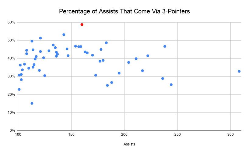 His teammates give him space to mash down low, and the flexibility to kick out a pass if the defense collapses. Out of Giannis’s 5.5 assists per game, 58 percent have led to 3-pointers—best in the league for everyone with at least 100 total assists this season, according to data derived from pbpstats.com. Giannis is the red dot in this graph. (The dot to the far right, with 64 more assists than anyone else, is LeBron James, whose partnership with Anthony Davis is by far the most fruitful in the league.)