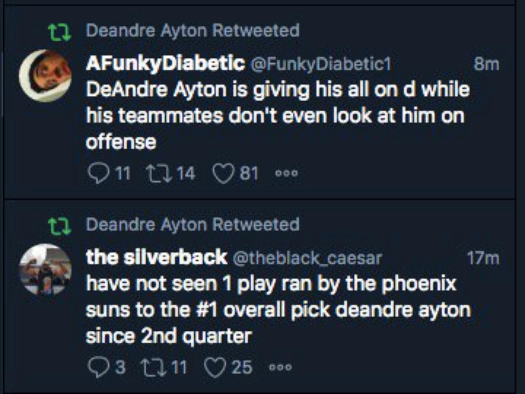 Reddit users debated whether Ayton could’ve retweeted it himself, and according to multiple people, it happened while the Suns-Hawks game was still in action, so it’s unlikely that Ayton retweeted these himself (and the tweets have since been un-retweeted). But even setting those tweets aside, it’s clear that Ayton would’ve resented Lee’s retort. The 20-year-old isn’t on board with losing. And, after dropping Phoenix’s 17th straight L, the most freshly inducted member of the Suns’ four-year-long tank has decided it’s time to reverse course.