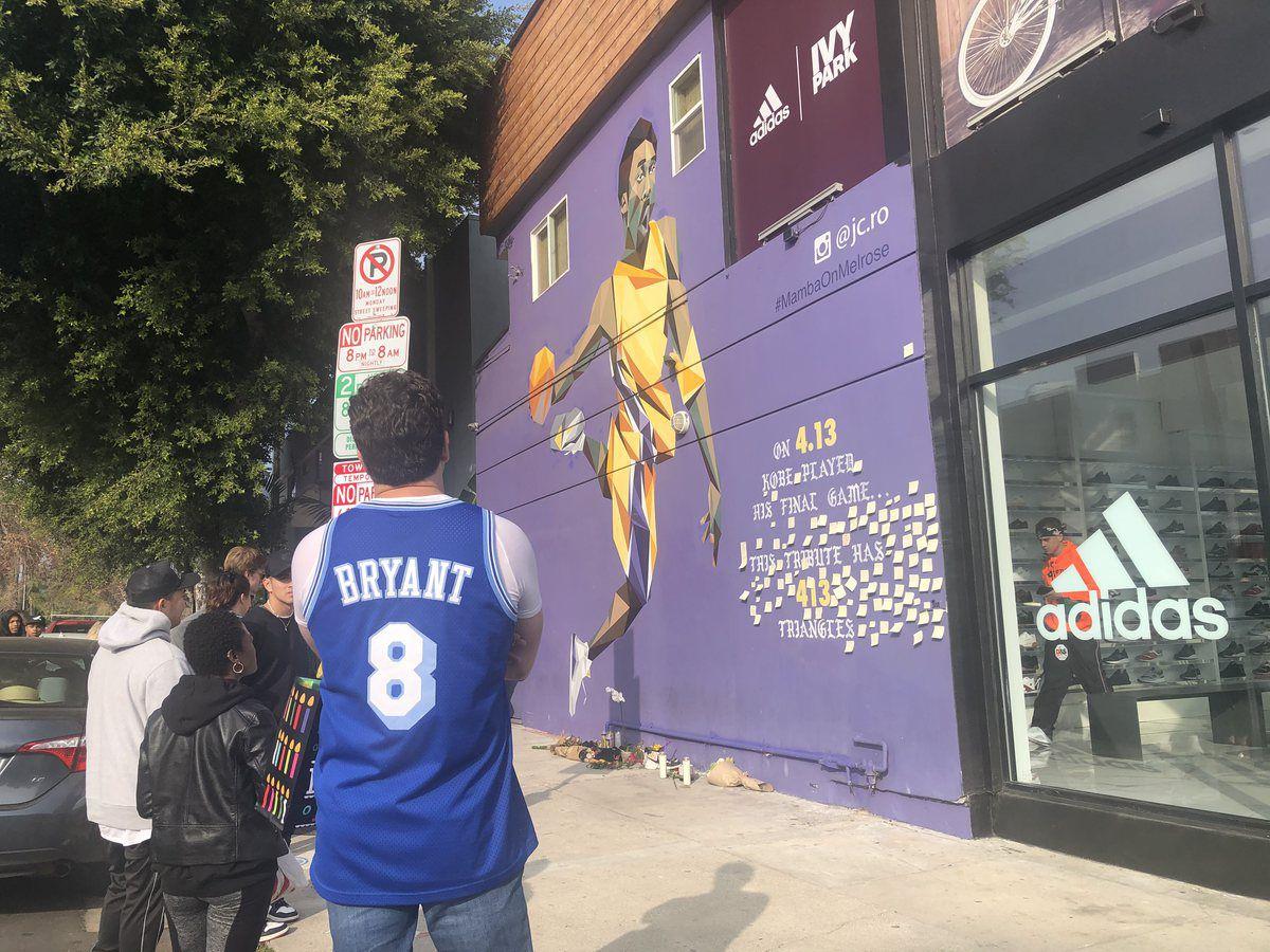 On Melrose, the scene was far more intimate. Cars drove by with the news of the crash playing on their radios, and a smaller group stared at the mural with red faces and glassy eyes. Many took pictures and immediately uploaded them to social media. Some placed flowers, candles, and notes on the ground alongside worn pairs of Kobe shoes. By 2 p.m. PT, the Shoe Palace had sold out of all of Kobe’s sneakers, even after the store limited purchases to two pairs per person and eventually to just one.