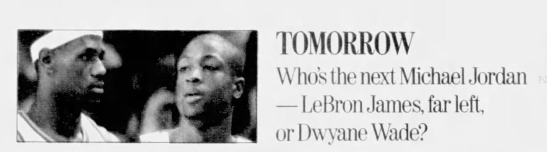 First mention: Similar to Penny, Wade didn’t get referred to as the “Next Jordan” until he was already in the NBA. And the first direct mention came in March 2005, just before he faced off against another “next Jordan”—his future teammate and best friend, LeBron James.