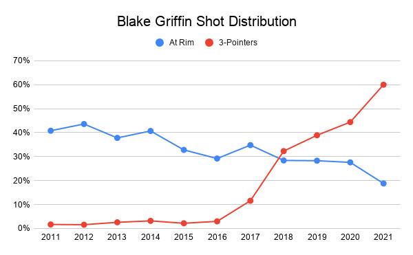 It’s not just that Griffin is averaging career lows in points (13.9 per game) and rebounds (5.7). It’s that his game has changed so drastically. Even as he developed a respectable 3-point stroke in recent seasons, Griffin still made his way to the rim for a healthy portion of his shots. That ratio has now cratered. He’s settling for a much higher proportion of 3-pointers instead.