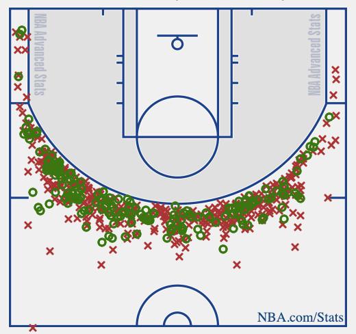 … to Steph Curry’s 2018-19 chart, and look at how much more space Steph covers, with all those corner tries—both stretching the defense in different ways and giving him easier looks than if he took all his shots above the break. (That season, Curry hit 42.9 percent of his above-the-break 3s and a ridiculous 50.4 percent from the corners.)