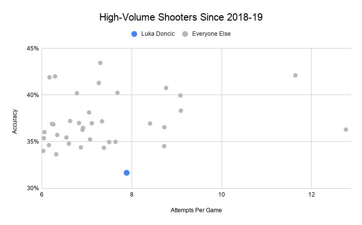 Or, put in another context: Since the start of last season, Luka’s shooting 30.8 percent from distance. Giannis Antetokounmpo, whose 3-point struggles have spawned bushels of takes, is at 29.9 percent over the same timeframe.