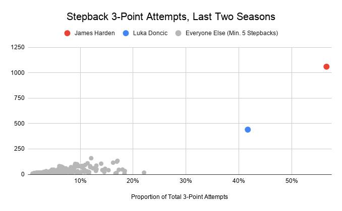But Doncic, and coach Rick Carlisle, can also take proactive steps to help bump up his figures toward the average. Contrary to some belief, stepbacks are not the problem. Oh, he takes a bunch. Over the first two seasons of his career, Doncic took 440 stepback 3s; according to data supplied by NBA.com/Stats, besides Harden (all the way up at 1,059 stepbacks), nobody else is even halfway to Luka’s total. This graph is a work of absurdist art.