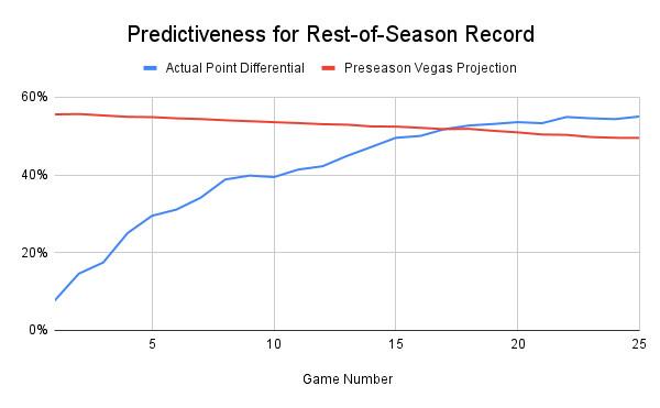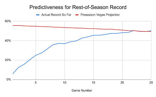 So if 10 games isn’t enough to significantly change perceptions of a team’s quality, then how much data do we need in order to come to firmer conclusions? The answer is 25 games. After 10 games, a team’s record offers 37 percent predictiveness for its performance over the rest of the regular season; at the same time, a team’s preseason Vegas projection offers a more robust 54 percent predictiveness. But by Game 25, a team’s actual early-season record becomes more predictive than its Vegas projection going forward.