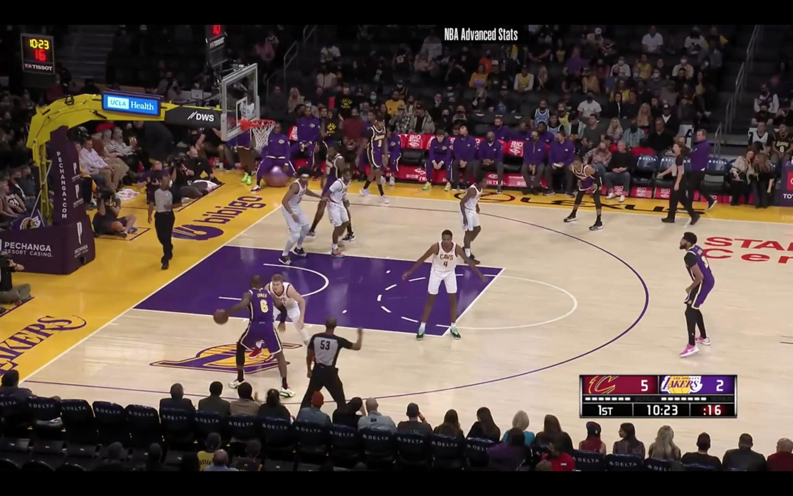 A survey of how defenses are guarding the Lakers illustrates LeBron’s challenge to reach the basket with Westbrook on the floor. Here, for instance, is a screenshot of LeBron facing up Lauri Markkanen a minute into a win against Cleveland last week. LeBron should be able to bully Markkanen—and did, several times, later in the game—but settles for a stepback 3 on this play. That’s a suboptimal shot, but where exactly is LeBron supposed to go when all four Cleveland help defenders, including rim protectors Evan Mobley and Jarrett Allen, are touching the paint?