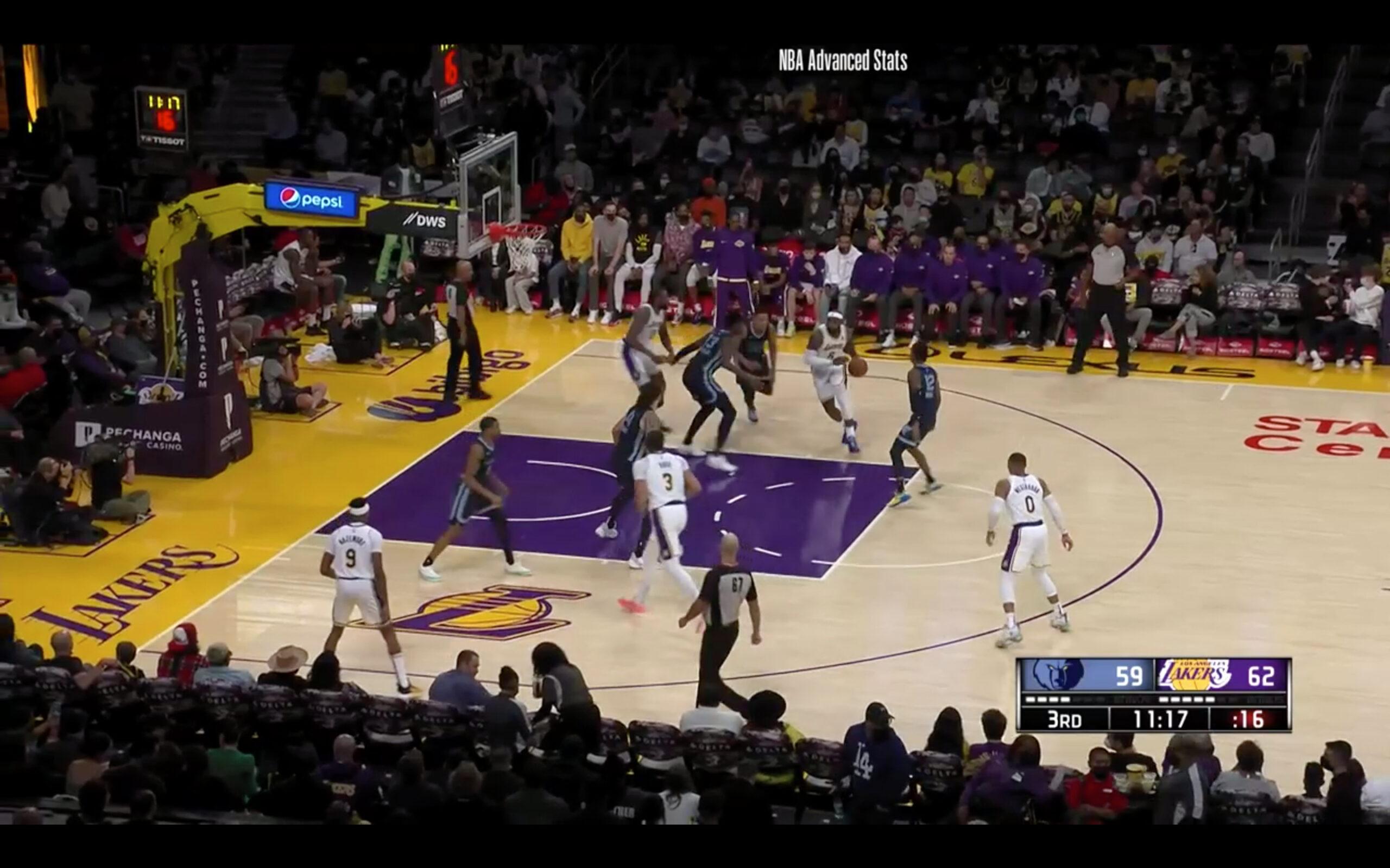 It’s easy to pull out a similar image from every time the Lakers have used a Westbrook-LeBron-center lineup. Here’s one against Memphis, as a promising pick-and-roll in the post sputters when LeBron is immediately surrounded by three Grizzlies defenders, including Ja Morant playing well off Westbrook. This play ends in a 3-point try for Westbrook, the least accurate high-volume 3-point shooter in NBA history.