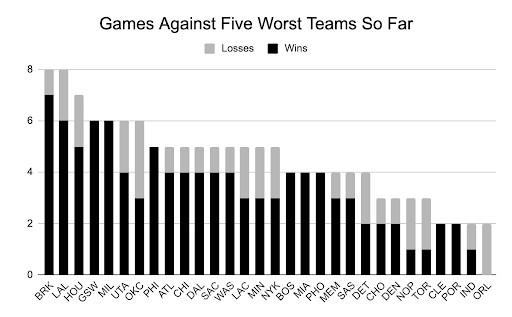 Over the full season, the Lakers have already played eight games against the five teams that reside at the bottom of the standings (the Magic, Pistons, Rockets, Thunder, and Pelicans). That tally is tied for the most for any team. The Lakers should have taken advantage of all those easy games, but haven’t, with two losses to the Thunder contributing to their middling record so far.