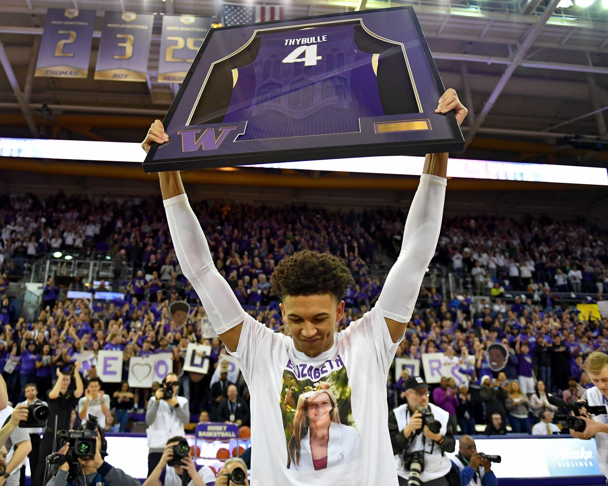 For Thybulle’s college senior night, his friends and family stood at center court, all wearing shirts bearing a photo of Elizabeth.