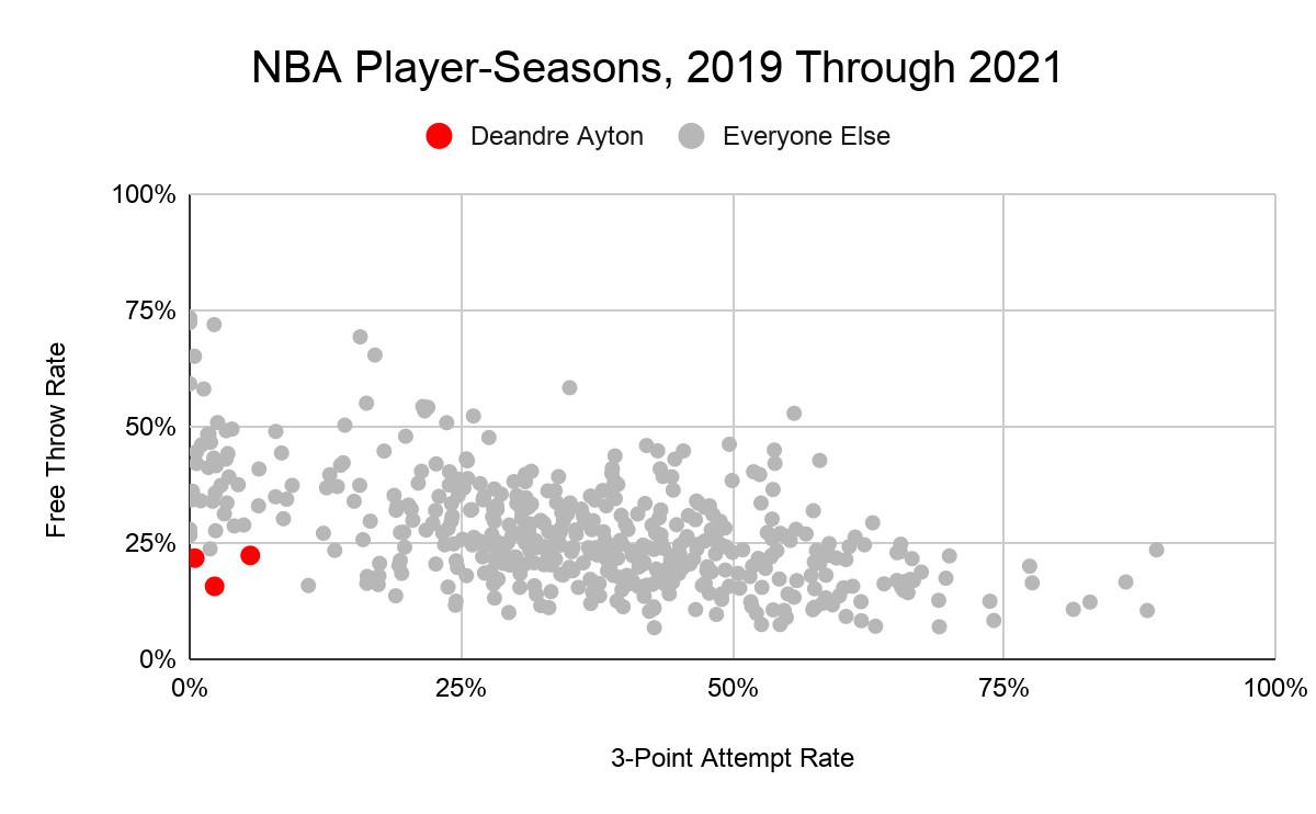 Perhaps Ayton, with that awkwardly jutted elbow in his shooting form, won’t ever develop Vucevic’s comfort from distance. But then he must improve his foul-drawing ability, both to embrace one avenue of scoring efficiency and to stop sticking out like an unfortunate outlier in the modern NBA. Among fellow bigs, he’s always ranked among the leaders in the percentage of his shots that come from midrange.