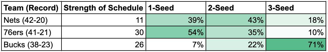 Let’s start at the top of the East, where three teams have clearly separated from the rest of the pack. Look at the closeness in the race for the top spot! The Nets have a one-game lead, but the 76ers have the tiebreaker if the teams finish with the same record, as well as the league’s easiest remaining schedule. The Nets still play the Nuggets, Bucks twice, and Mavericks; the 76ers play only one more opponent, the Hawks, that’s in the top six in either conference.