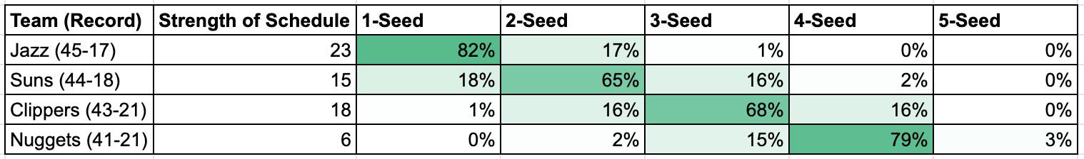 Now let’s shift to the West, where the Jazz have held the no. 1 seed every day since February 2. The team’s lead has dwindled, after consecutive losses to the Timberwolves, to just one game over the Suns. Yet thanks to an advantageous schedule, the Jazz remain heavy favorites to finish with the conference’s top spot.