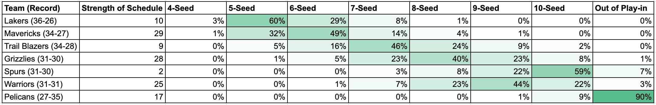 That bit of forecasting is impossible this far out—but one near-certainty is that the 10 Western teams currently in the playoff or play-in fields will stay there. New Orleans, in 11th place, is now four games back of 10th, and catches up to the field only 10 percent of the time.