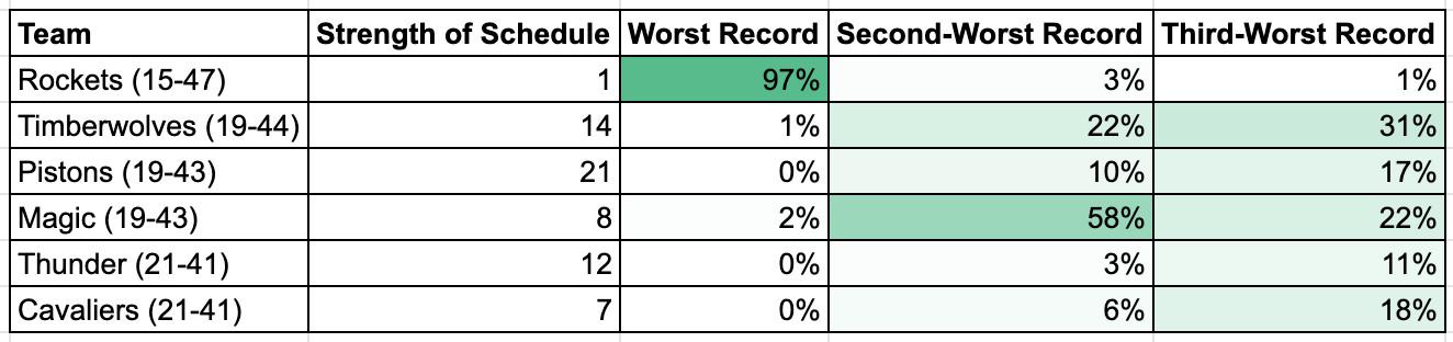 Houston is a near-lock to finish at the bottom, as it boasts both the league’s worst record and the hardest remaining schedule. The Rockets should enter lottery night with essentially a 50-50 chance to keep their top-four-protected pick; otherwise, it will convey to Oklahoma City via a pick swap.