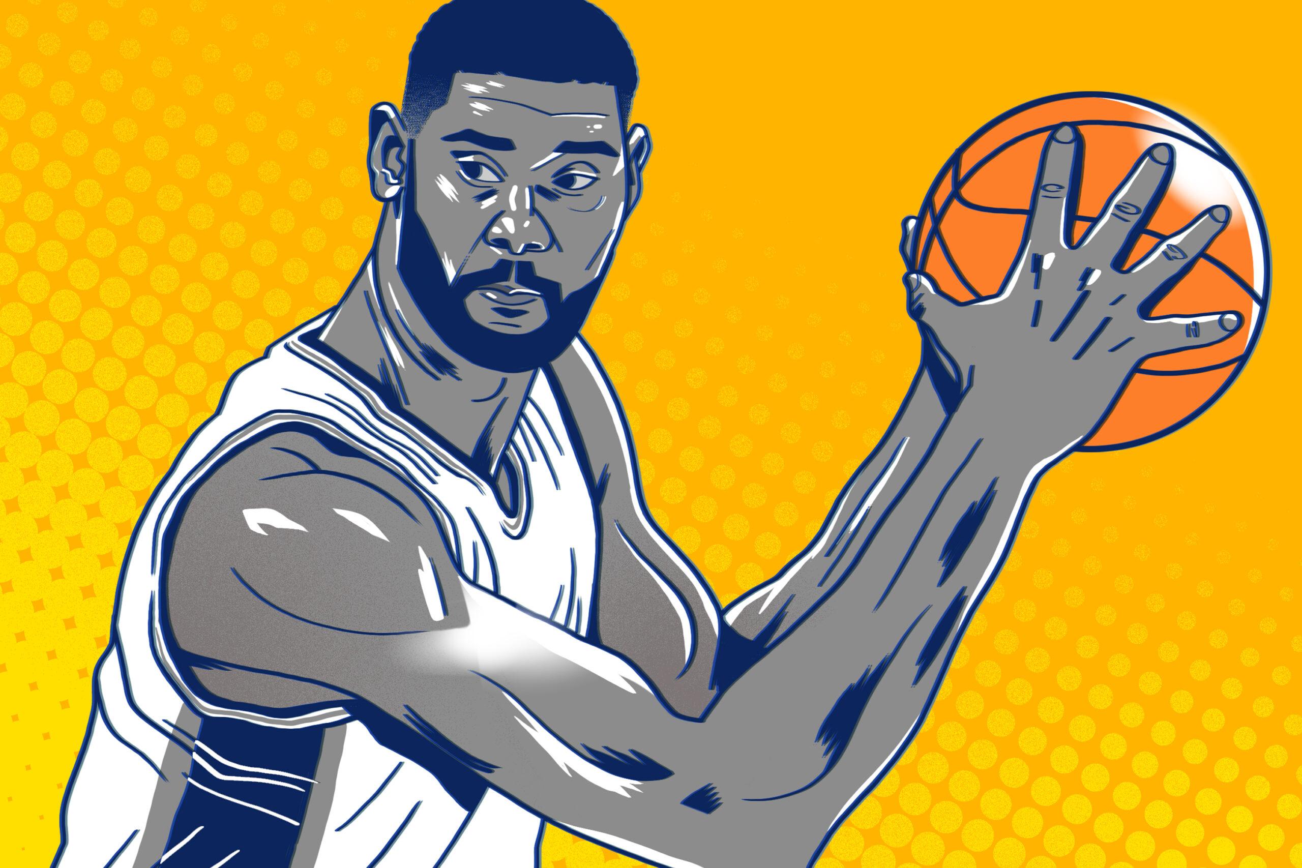 Duncan had a precise combination of footwork and finesse, one that takes most players years to perfect. One possession, he’d catch the ball on the left block, spin baseline, and, with his body almost sideways, loft the ball with one hand over his right shoulder and off the glass. The next, he’d turn to face the hoop, jab his right foot to create space, and then fire a laser off the box that somehow would drop through the net. He preferred the left block, but could find the backboard from any spot on the court. He quickly earned the nickname “the Big Fundamental.” The bank shot wasn’t the only reason, but it would become the signature move of a singular NBA career.