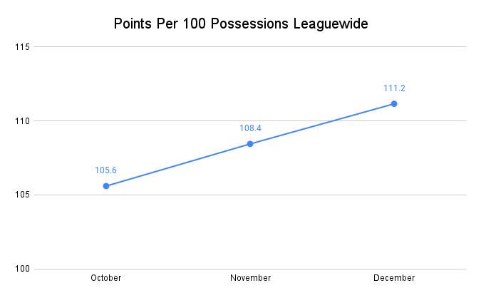Overall quality of play hasn’t dropped off much, either; the leaguewide offensive rating actually increased in December. While scoring efficiency usually rises as a season progresses, roster interruptions did not interfere with this typical trend.