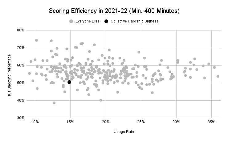 But they don’t look extraordinarily out of place next to the best players in the world. Replacement players’ PER, weighted by minutes played, is 9.7—not a good score, given that 15 is average, but in the range of many well-known NBA players: Jae Crowder, Duncan Robinson, and Matisse Thybulle are all at 10.2 this season; Jalen Green and Davis Bertans are at 10.1; Joe Harris, Kevin Porter Jr., and Payton Pritchard are at 9.8; and players like Robert Covington, Talen Horton-Tucker, and Killian Hayes all rate below the hardship group, to say nothing of the many back-of-the-bench players who do as well.