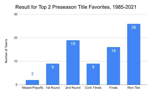 It’s difficult to gauge each team’s preseason outlook in the earliest NBA decades, but we can at least start in 1984-85, which is the first season for which Basketball-Reference lists preseason title odds. Among the betting favorites over that span, the Lakers immediately shoot to the bottom; this graph shows the ultimate result for every other top-two favorite entering the season: