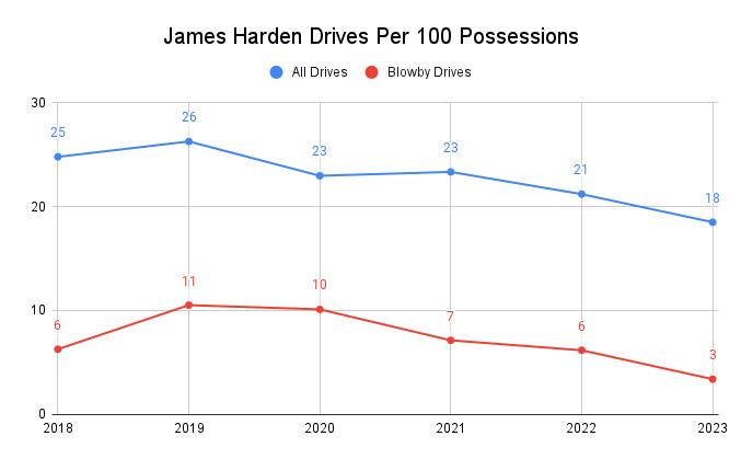 Harden’s aging, with a whole lot of miles on his tires. As old Ringer pal Dan Devine noted last month, Harden’s played the second-most combined regular and postseason minutes in the past decade, behind only LeBron James. It might not be a coincidence that Harden is driving and blowing by his defender much less often this season than any other on record. Given that Harden has never been the most successful playoff performer, even at his peak, it’s an open question whether this somewhat diminished version can succeed where previous iterations failed.