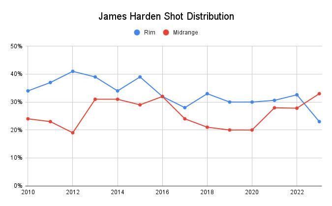 But there are still worrisome signs. For instance, Harden is simultaneously taking a career-high rate of his shots in the midrange and a career-low rate at the rim, according to Cleaning the Glass—which is probably not a matter of consciously trying to diversify his shot distribution, but rather an indication that he’s having trouble getting to the rim in a situation to score.
