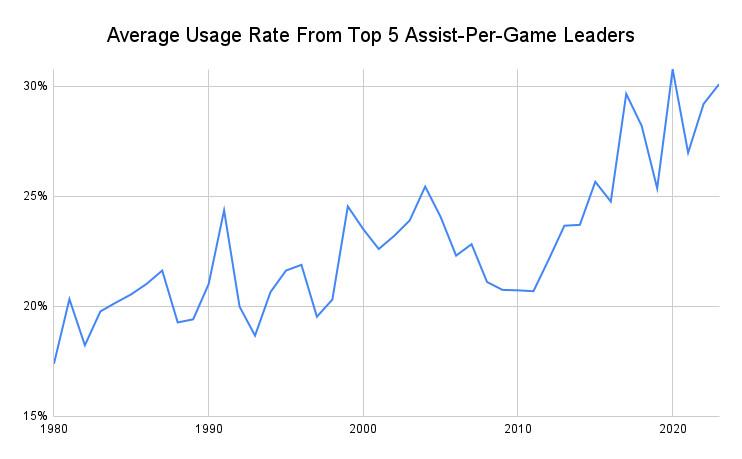 Like with other statistical categories, modern strategies are pushing point guards further away from this record. Stockton’s career usage rate was 18.9 percent, never climbing above 21 in any season, which placed him right in line with most of the top passers of his era. But in today’s heliocentric environment, the NBA’s assist leaders are regularly flirting with 30 percent usage rates and higher—which cuts down on their opportunities to rack up assists, if they’re creating more shots for themselves than their teammates.