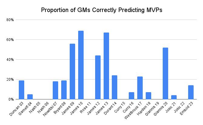 Put another way, in the past two decades, NBA GMs have missed entirely on six MVP seasons while correctly predicting only four as a group.