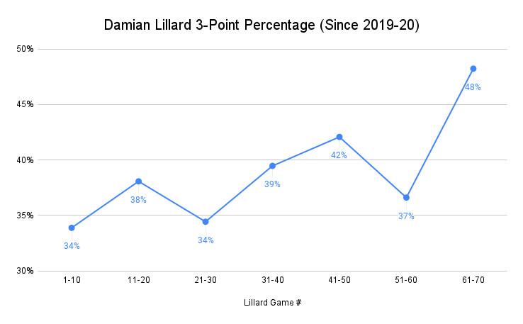 Over the past half decade, Lillard has tended to heat up as the season progresses. (Leaguewide 3-point accuracy rises by a small amount over the course of the season.)