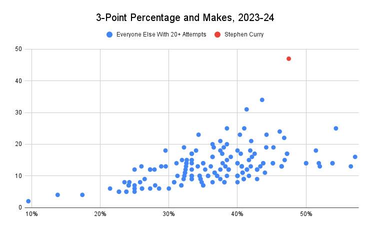 That’s especially true of Curry, who’s been the best of the trio in the early going—and arguably the best offensive player in the entire league. Curry is averaging 31 points per game on 53-47-91 shooting splits, making six 3-pointers per game, and shooting a career-best 64 percent on 2-pointers. His isolated placement on this graph is hilarious.