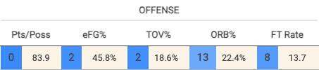 So it makes unfortunate sense that in a small sample, the Suns without Durant or Booker on the floor have scored an atrocious 83.9 points per 100 possessions, per CtG. Those lineups are basically the worst in the league at everything related to offense. (The numbers with a blue background are percentile ranks.)