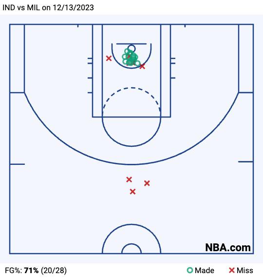 So far, that’s more of a quirk than an actual problem. The Bucks have lost role players to injury and managed a minutes limit for Middleton and still rate as one of the most productive offenses in NBA history. They’ve absolutely demolished teams in the half-court and—living up to Lillard’s reputation—they’ve been aces in crunch time. This may be the best scoring season we’ve ever seen from Antetokounmpo, whose blunt-force dominance in the paint has veered into absurdity. The career-high 64 points that he dropped on the Pacers last week turned out to be a performance that launched a thousand memes, but all the commotion over the game ball distracted from the most unstoppable shot distribution you’ll see all season:
