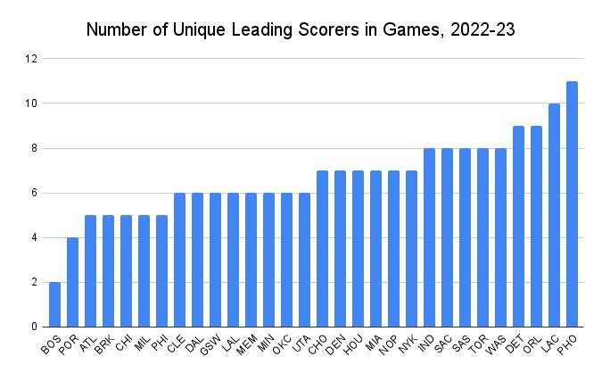 And so far this season, either Tatum or Brown (or both, on five occasions when they’ve tied) has led the Celtics in scoring every single game. Every other team has had at least four leading scorers, with a league average of 6.7 unique leaders.