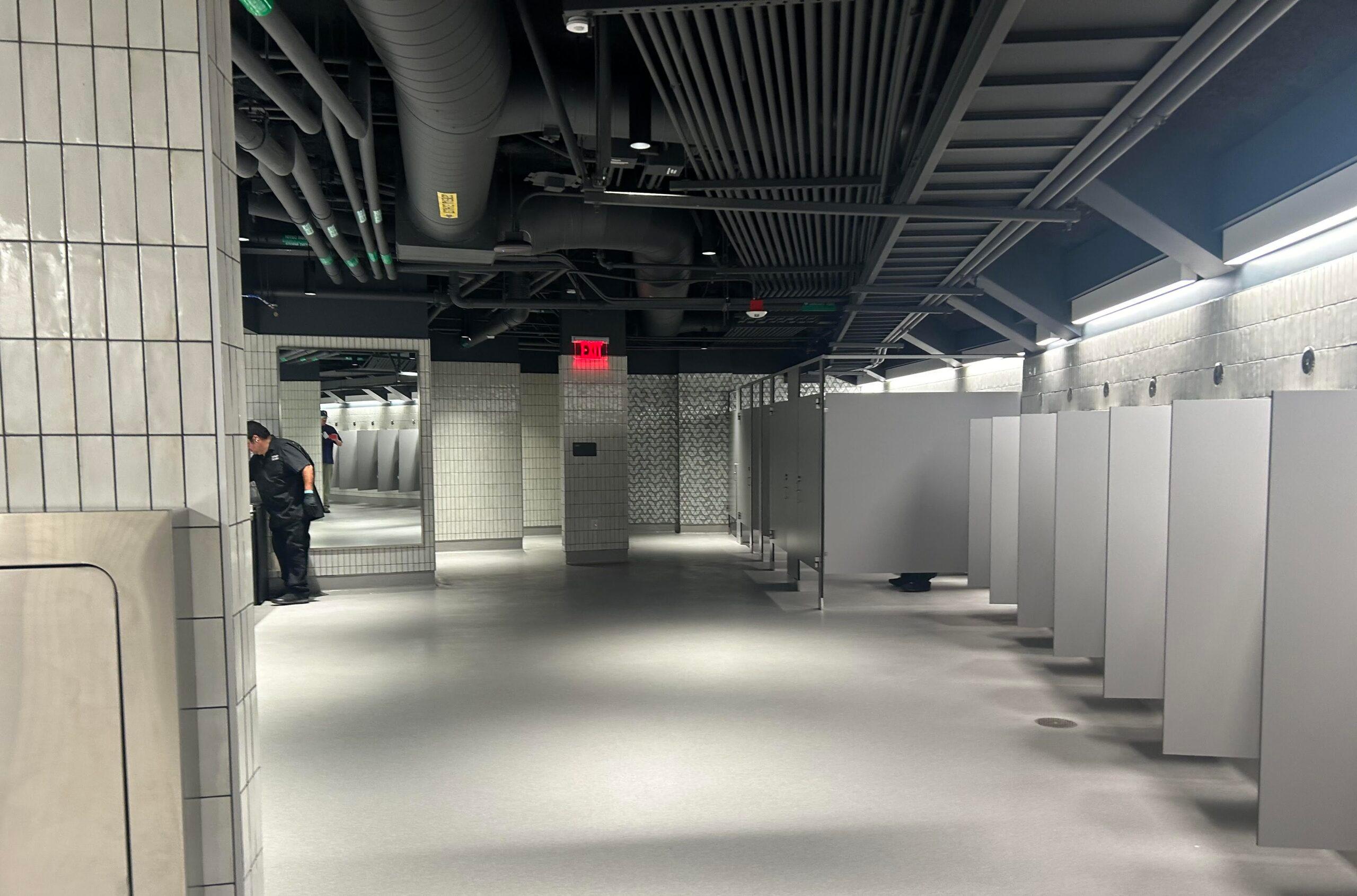 What I expected: mood lighting, dark wood trim, hardwood floors, screens in the stalls, in-game audio, futuristic country club commodes equal parts stylish and high-tech. Not bidets, but maybe seat warmers. The softest two-ply money can buy. Urinal cakes with Tim Cook’s face on them. Couches, candles, mints, that weird spray deodorant Arrid makes. Mouthwash and floss, Tylenol and BOSS. Some dude in a dress vest handing me paper towels with crests on them.