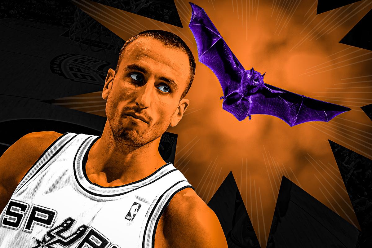 The bat would have less luck during its second and final visit to the court. Manu Ginobili, future Hall of Famer and the greatest sixth man of all time, took matters into his own hands. Well, hand. He swung on the bat with his powerful left, knocked it out of the air, and sent it crashing to the ground. It landed on the hardwood, and the AT&T Center broke into delirium. Laughter and applause, laughter and applause. Ginobili picked up the bat and walked it off the floor. Someone on the Spurs medical staff brought him hand sanitizer, and the game moved on.
