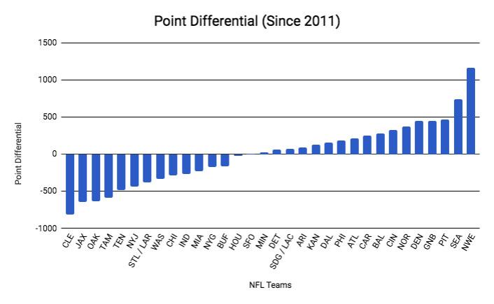 The Pats have lapped every team in point differential except Seattle, and their figure is three times (!) that of the sixth-place Saints (plus-371). (Also, shout-out to the Browns for being last in both of these charts, but still not nearly as bad as New England is good.)